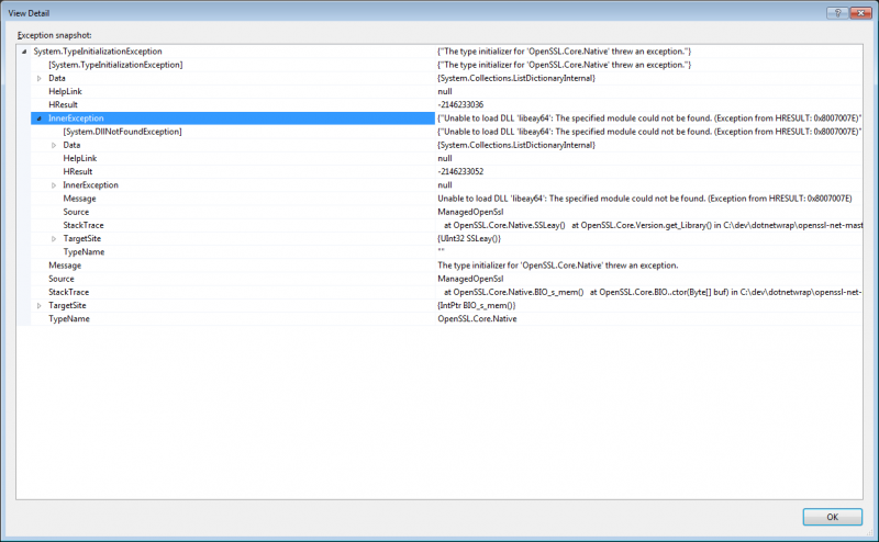 В SDK есть масса примеров по работе с ЭЦП на C#, но при попытки запуска в веб-приложении OpenSSL.Core.Native бросает исключение "Unable to load DLL 'libeay64': The specified module could not be found. (Exeption from HRESULT: 0x8007007E)". Скрин с более подробной информацией во вложении.